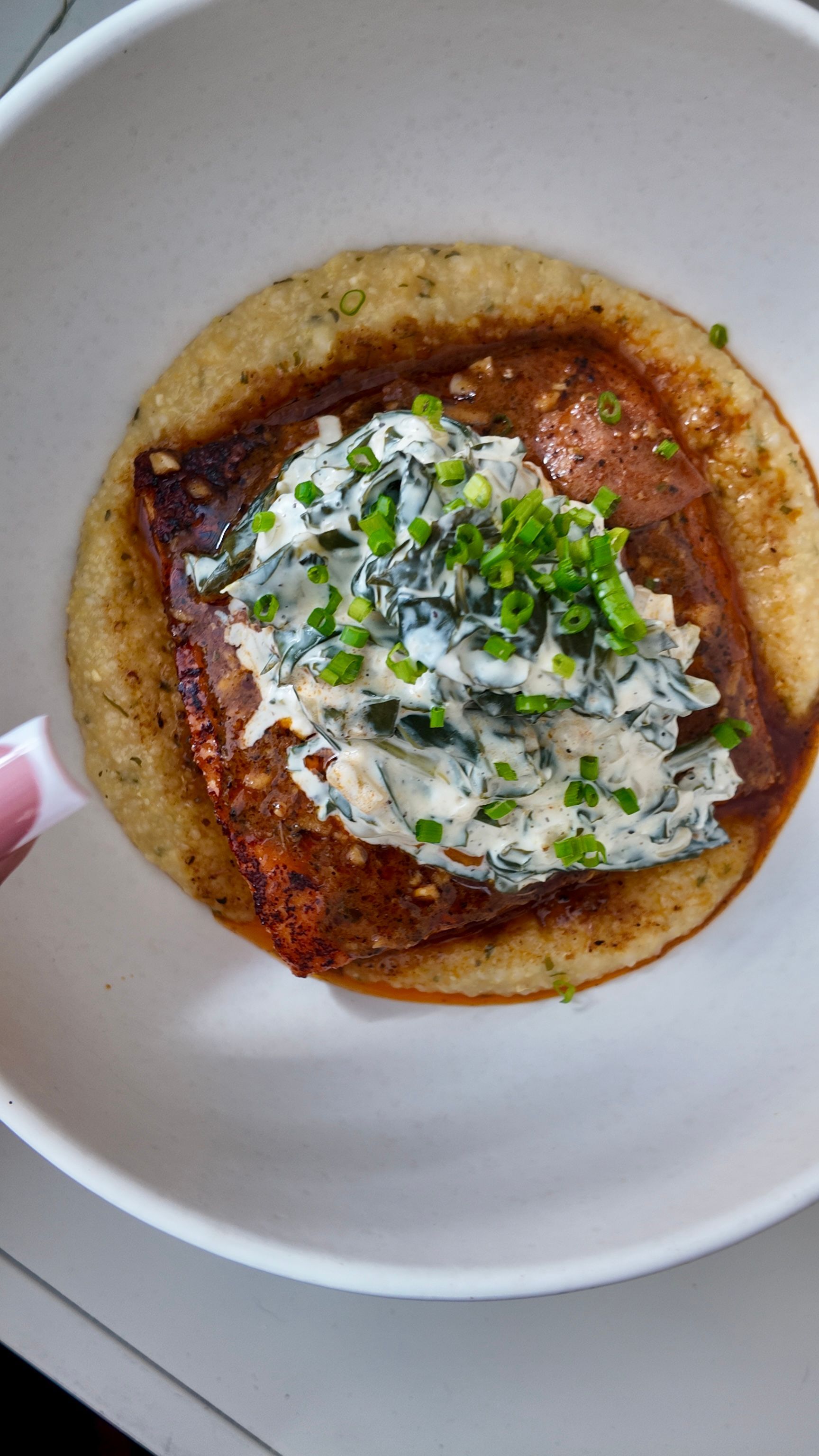 Spoon those warm grits into a bowl, nestle a salmon fillet on top, and ladle that smoky andouille sauce over everything. Add a little green on top if you’re feeling fancy.
